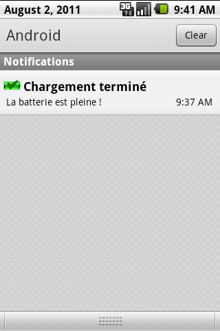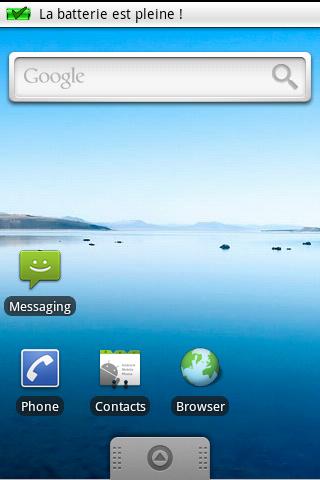 Cette application vous avertit lorsque le chargement de la batterie est termin.Cette version est une version de dveloppement. n39;utiliser qu39; des fins de test Un redmarrage du tlphone peuttre ncessaire.L39;application doit tre stocke sur le tlphone et non sur la carte SD.Test sur les appareils suivants : HTC Desire HTC Wildfire LG Optimus One Samsung galaxy Ace Samsung Galaxy mini Samsung Galaxy S Samsung Galaxy S2 Samsung Galaxy Tab SEMC Xperia X10 SEMC Xperia X10 Mini