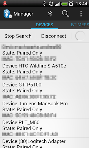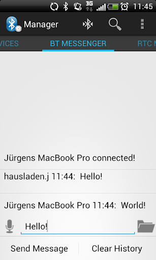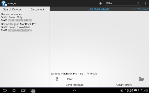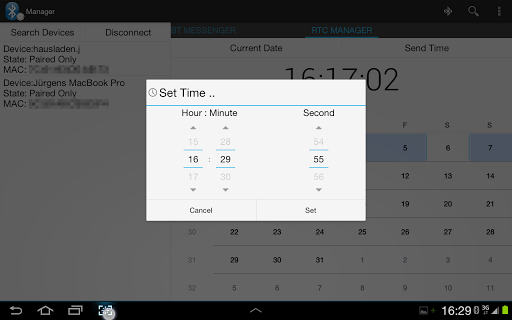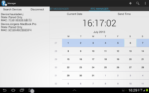 Bluetooth SPP Manager is an app, which provides communication between Bluetooth enabled devices. Therefore it uses the RFCOMM Protocol also known as Serial Port Protocol (SPP) to transmit data between devices. This app shows various properties of connected Bluetooth devices as well as devices around and communicates with them. A built in server can accept incoming connections from any other device. Furthermore this app has an integrated Real Time Clock Manager. With this feature someone can send the current or some predefined time to a remote device. For example this enables to set the RTC of a microcontroller and further show the current time on a LCD.