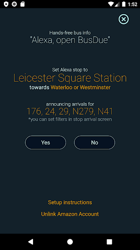 버스가 도착하면 알고 싶습니까?BUSDUE가 돕기 위해 여기에 있습니다!그냥 "Alexa, Open Busdue" ↑ v 가장 가까운 정류장을 찾으십시오바이 턴 맵 네비게이션 ↑ 인근의 인터체인지, 거리, 걷는 시간 추정치를 포함한 추가 정지 정보