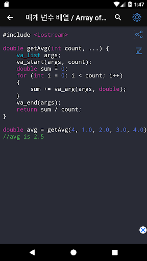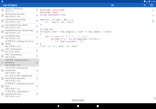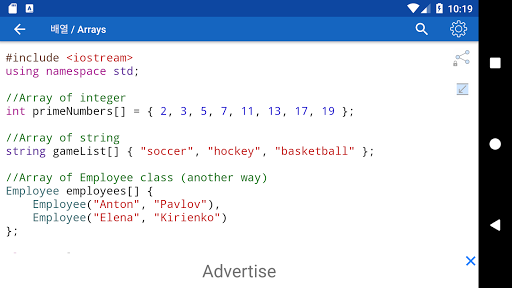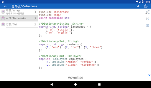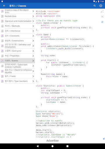 특정 코드 샘플에 대한 언어 구문을 학습. 문자열을 가르는 방법은? 일반화된 메서드를 선언하는 방법은? 각 언어에 대한 250개 이상의 다른 코드 샘플(C 용)은 애플리케이션에서 사용할 수 있습니다.