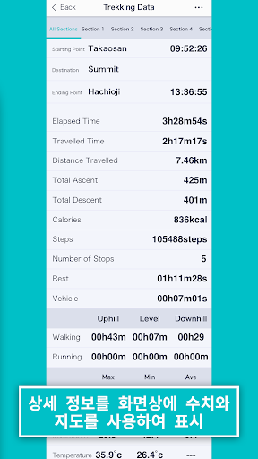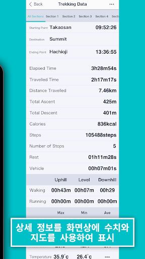 ・로그 데이터의 각 유형(이동 경로, 경과 시간, 이동 시간, 이동 거리, 고도, 방위, 온도, 걸음수, 케이던스)이 실시간으로 표시됩니다.
