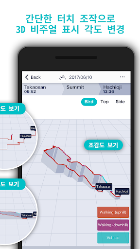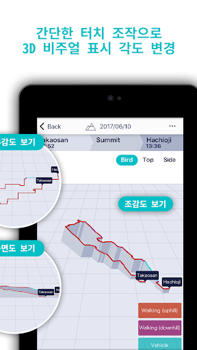 ・로그 데이터는 3D 그래픽으로 표시됩니다. 터치 조작으로 활동을 다양한 각도에서 다시 떠올릴 수 있습니다. 데이터를 위에서 또는 옆에서 볼 수 있습니다.