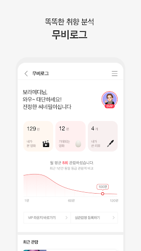 - 나의 관람 내역으로 분석된 취향 데이터로 상영 중인 내 취향 영화를 바로 예매 할 수 있어요.