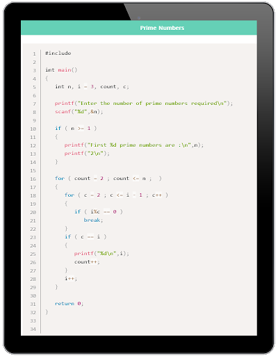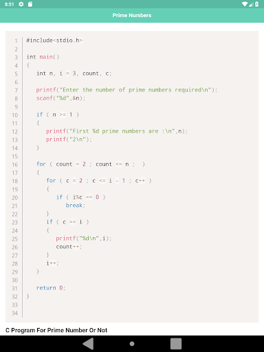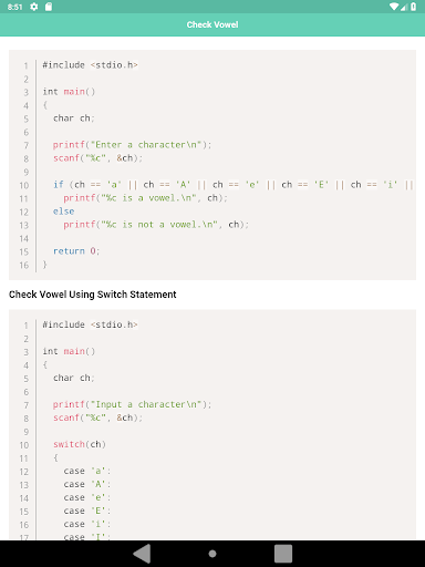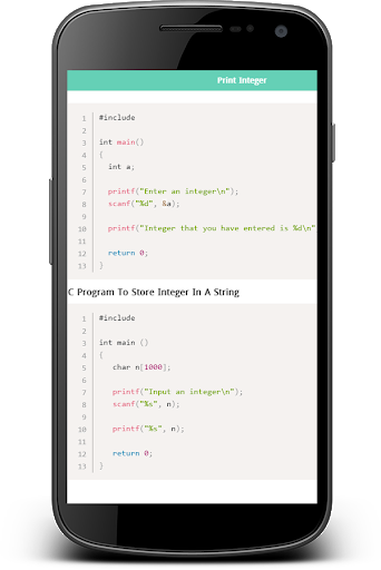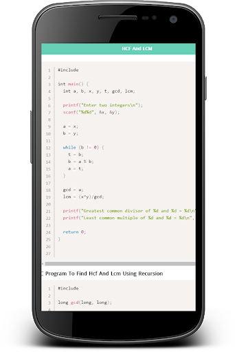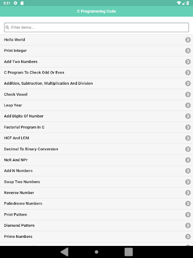 This app contains examples on basic concepts of C programming like loops, functions, pointers, structures, Sort, Search, String, File operations etc.