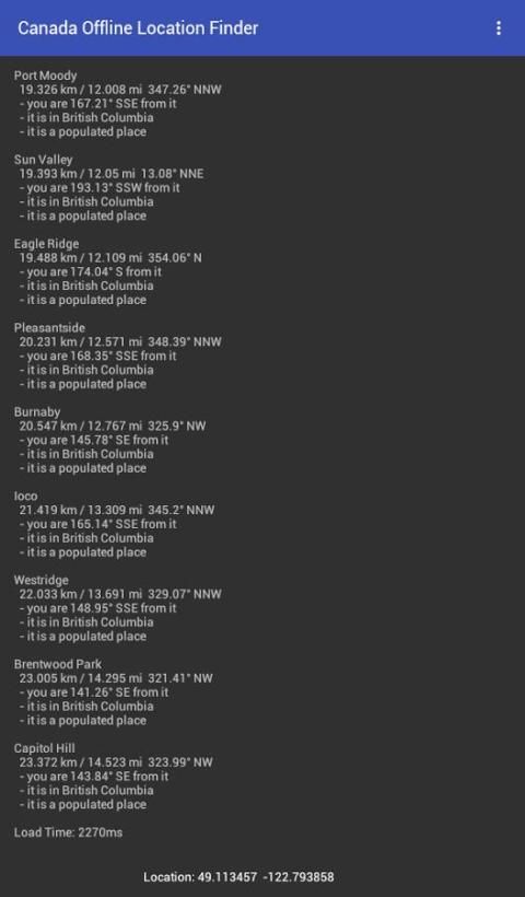 So if you have any "technologically challenged" friends / family and need a fix on where they are, you can just have them load the app and tell you. They can say "I am 2kms from Thunder Bay" which would mean that you are 2kms 15 degrees NNE from the center (usually where the Bus Station is) of Thunder Bay.