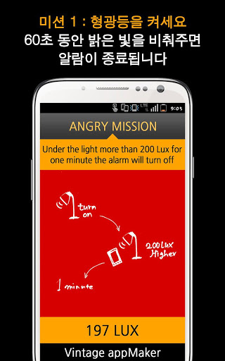 형광등 200 lux 이상에서 1 분 동안 있어야 알람이 꺼집니다.