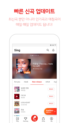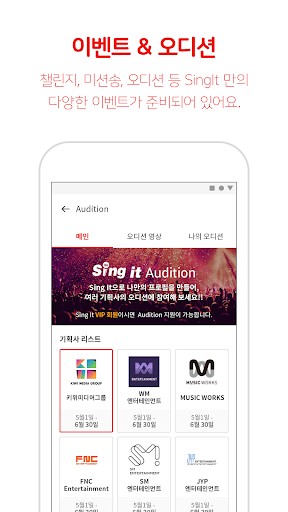 - [이벤트참여] 챌린지, 미션송, 오디션 등 SingIt 만의 이벤트들이 준비되어 있습니다