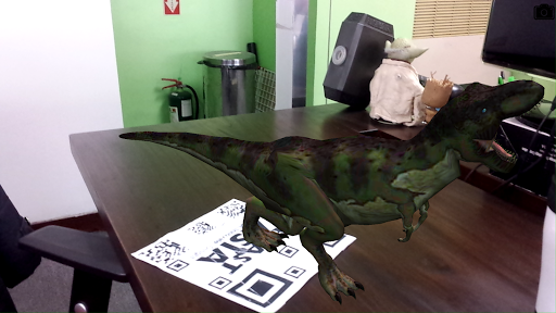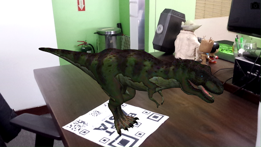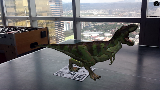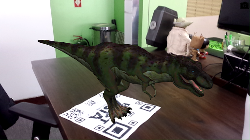 타겟 디스플레이가 카메라 앞에 올려지면 Tyrannosaurus Rex가 나타납니다. 공룡으로 셀카를 타십시오.)