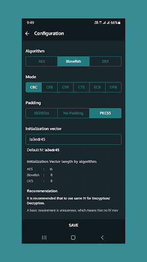 이 응용 프로그램은 AES, Blowfish 및 DES 알고리즘을 사용하여 텍스트/메시지를 암호화/암호화 할 수 있습니다.