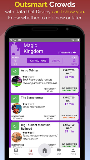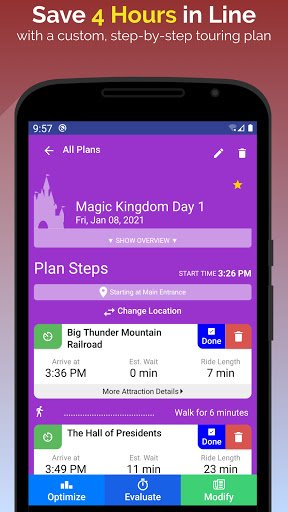 Sustomized 단계별 여행 계획 디즈니 파크. 당신이보고 싶은 라인을 말하면, 선은 긴 줄을 피하기 위해 각 타는 것을 방문 할 때를 보여주는 단계별 여정을 만듭니다. 공원에있는 동안 계획을 변경할 수도 있습니다!