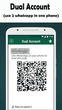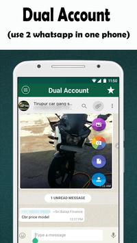 Dual Account for whatsapp options, try this app. It gives tons of multiple options, no matter what are your needs related to the Facebook owned platform. This is a companion app created for Whatsapp! It enables you to have dual whatsapp or double whatsapp i.e 2 whatsapp in 1 phone.