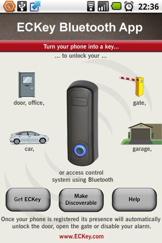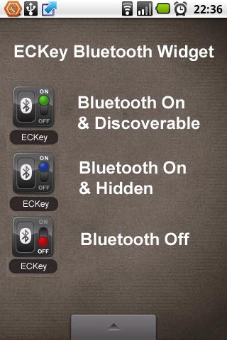 ECKey bluetooth manager toggling between off, onand discoverableUse this widget to make Bluetooth discoverable with two clicks to activate your ECKey unit.Remember to add as a widget to your home page.note that an ECKey unit is required to open doors, garages etc.New features in version 1.1Toggle from BT discoverable to BT off
