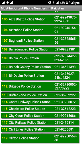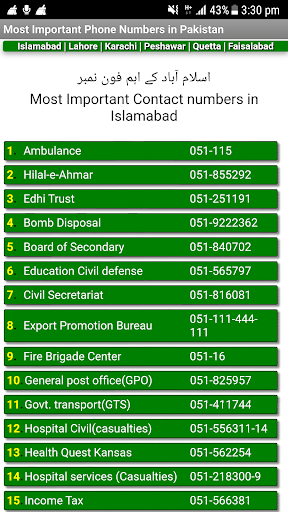 중요 숫자 구급차, Hilal-e-ahmar, Edhi 신뢰, 폭탄 처분, 보행위원회, 교육 jobense, 민간 사무국, 수출 진흥 사무소, Fatmid 혈류 수혈, 소방 여단 센터, 일반 우체국 (GPO), 정부. 교통 (GTS), 병원 민사 (사상자), 건강 퀘스트 캔자스, 병원 서비스 (사상자), 소득세, 대도시 공사, 소식 기관 (앱), 경찰 비상 사태, 경찰 기차역 (도시), PIA 항공편 문의, PIA 예약 , Pia Cargo, Passport Office, 파키스탄 관광 개발. 공사, 파키스탄 육군 (모집), 파키스탄 해군 (모집), 철도 문의, 철도 예약 (Cantt.), 철도 예약 (도시), 수이 가스 불만, 시간 조회, 전화 조회, 전화 불만, 트렁크 예약, 트렁크 내륙 문의, Phonogram, 인쇄 검토, 해외 예약, 해외 문의, 전신 문의, 텍스트 도서 보드, 대학, Aiou, UET, 날씨 문의, Wapda 문의, 알 - 머스타파 당뇨병 및 진단 센터, Edhi 본사, Edhi Emeres. 센터, Edhi 복지 센터, EDHI 구급차, FATMID 재단, St.John Ambulance, Red Desent, Al-Mustafa 복지 신탁, Alamgir 복지 신탁, Chhipa 앰뷸런스, 비상 사태, 비상 사태, 긴급, 중앙 소방서, 중앙역, 발디 마을 화재 역, 소방서 PIA, 가스 소방소, KEMARI, KPT 소방서 TPX, KPT 소방서 웨스트 워프, KPT 소방서 OP-L, Landhi 소방서, 리아리 소방서, Manzoor Colony Fire Station, Nazimabad 소방서, 새로운 카라치 소방서, 오랑이 소방서, Saddar 소방서, 샤 파이살 스테이션, 사이트 소방서, A-One 병원, 아스사인 센터, AK 센터, a.o.clinic (PVT.) LTD, ABBAS 클리닉, ABBASI Shaheed 병원, ABID Clinc, Afroze Medical Center, Aga Khan, K.R.H. Karinabad Medical Center, Ahmed Eye Hospital, Ahmed 병원 및 출산 가정, Ail 클리닉, Akhai 의료 및 당뇨병 센터, Akhtar Eye 병원, Akram Eye Clinic & Mehran Medical Complex, Al-Ain (Mukhtar Eye Hospital), 알 파티마 클리닉 , 알 - 힐랄 클리닉, 알 - Huda 병원, 알 - 마사 병원 및 출산 가정, 경찰 도우미 라인 (Madadgar), 공항 경찰서, 알 - 팔라 경찰서, Arambagh 경찰서, Art.Maidan 경찰서, 아지즈 Bhatti 경찰서 , Azizabad 경찰서, 바 하두라바드 경찰서, Bahadurabad 경찰서, Baldia 콜로니 경찰서, Binqasim 경찰서, Brigade 경찰서, 버퍼 존 경찰서, 캔트. 철도 경찰서, 차키와라 경찰서, 시티 코트 경찰서, 시티 철도 경찰서, 민간 라인 경찰서, 클리프톤 경찰서.