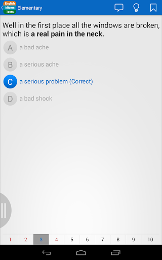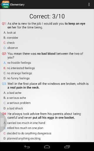 This test is designed for students of English as a second and foreign language, and allows learners to quickly assess their knowledge of English idioms and fixed phrases. An idiom is a common expression that has acquired a meaning that cannot easily be understood from the ordinary meanings of the words, as in “It’s raining cats and dogs" meaning "it's raining very heavily". At the end of the test you will see your test result and will be given a score.