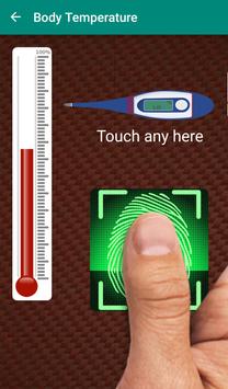 Spread the laugh and fun in friends with prank application. Body Temperature Checker Prank is an amazing prank application which calculates your body temperature by using your fingerprint. This application gives you a very User-Friendly way to calculate your Body Temperature using a digital thermometer.High Body Temperature is symptom of fever, malaria and other diseases. This app provides you with a very colorful and easy-to-use interface. A prank temperature sensor checks your Body Temperature and gives back random results. After Workout or Jogging the bod temperature can be changed. With the fast flow of the blood the temperature of the body can increased. After Exercise the Hear Beat Rate increases and results in increasing the Body Temperature. With low sugar and low BP the body temperature can decrease. With burning of Calories the temperature of body can vary. For accurate body temperature one should have proper check-up from authenticated doctor and valid instruments. Thermometer is usually used for measuring the body temperature. High body temperature indicates fever. Fever can be because of various diseases like headache, improper diet, flu and improper sleep. Water is necessary to keep body fresh and balanced. Daily Workout and Exercise keeps the life healthy and strong. Exercise may include push-ups, chin-ups and jogging etc. Healthy people have balanced and normal Body Temperature. Health is maintained with daily exercise. Low BP, High BP, low Blood Sugar Level or Glucose level or abnormal Heart Beat Rate means their is something wrong in the body and in such case the patient should have a proper check-up from the hospital and doctor. All the Blood Tests are necessary in such situations. Balanced Diet and Daily Workouts results into healthy and balanced life.