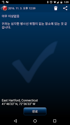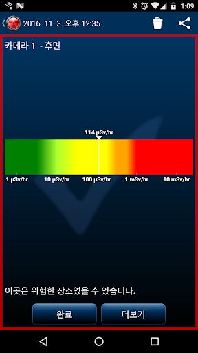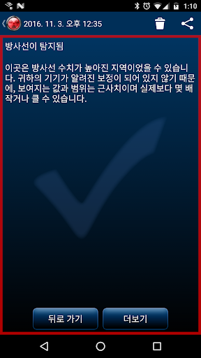 • 자동 감시 기능은 배터리의 ~1-5%를 소모합니다, 하지만 앱을 사용하고 있지 않은 때에도 귀하에게 방사선을 경고해 줄 수 있습니다.