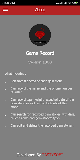 Gems Record is to record the type of gems, weight of it, from whom you bought it or from whom you get it, the mobile phone number of the seller or broker you deal with and additional remarks. You can also add 8 photos of gems. You can review your gems records details.