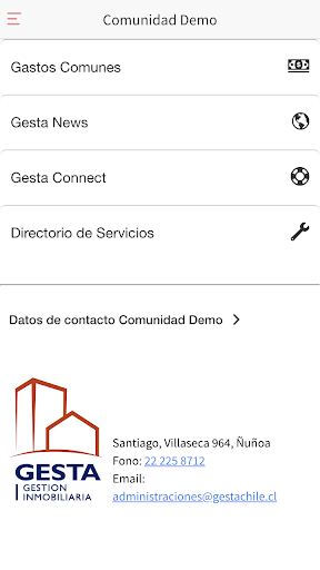 Primera APP para copropietarios y arrendatarios de las comunidades administradas por Gesta. En ella, una vez que el cliente se ha registrado, podrá pagar gastos comunes, ver las noticias de su comunidad, enviar avisos de situaciones puntuales al administrador y finalmente, podrán acceder a un directorio de servicios generales para el hogar.