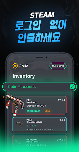 파트너의 프로모션 태스크를 완료하여 무료 CS:GO 스킨을 받으세요: 애플리케이션을 설치하고 설문조사를 작성하고 게임에서 작업을 수행하세요. 그러면 코인을 드립니다: 코인을 skins로 교환하고 멋진 스킨 몇 개를 얻은 후 트레이드 링크를 통해 Steam 계정으로 인출하세요. 모든 것이 g2a 및 csgolounge에서와 같이 작동합니다. 참고: 당사의 앱은 CS:GO 케이스 시뮬레이터 카테고리에 속하지 않습니다 - 당사에는 Steam으로 인출할 수 있는 실제 CS:GO 스킨만 있습니다.
