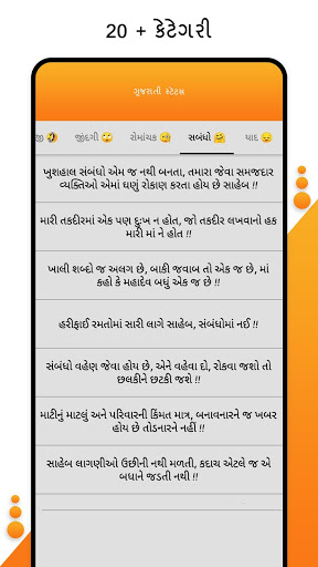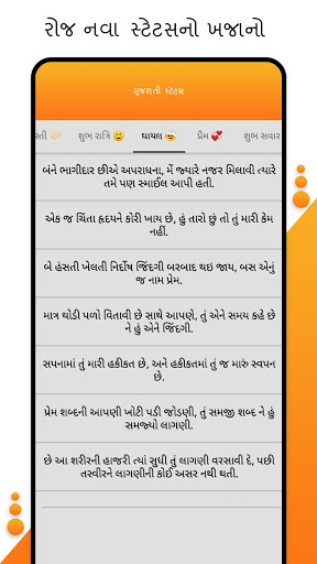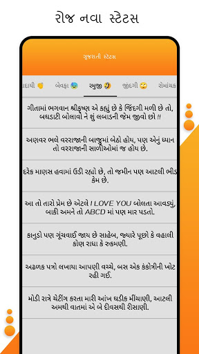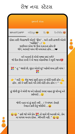 Gujarati Status 2020 is having many features :- * Share, * Swipe to change, * Favorite, * Copy, * Forward, * Material Design * Categories and many more option available in Gujarati status. Thank You.