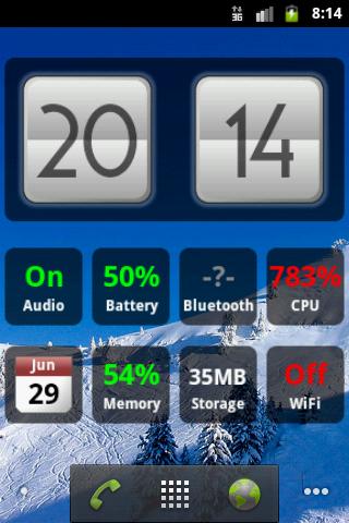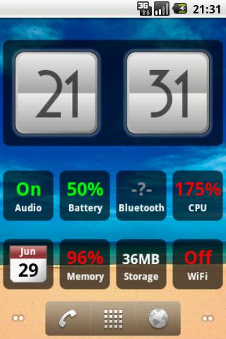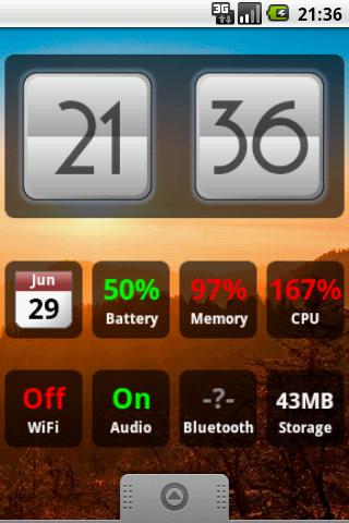 Simple, clean and customizable widgets for your homescreen, including:clock Date Battery statuswifi statusaudio statusbluetooth statusmemory usage CPU usage Free storage for apps internal WeatherPick the ones you needThis is the free version with adds included. Get the pro version for EUR0.79 to remove adds and receive new features and themes through updates