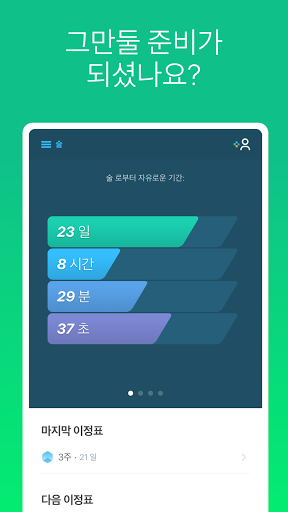 1일, 1주, 1개월 또는 그 이상의 이정표를 추적하고 기념하세요. 그리고 다른 사람들의 금주여정의 경험들과 비교해보세요. 이 이정표에서 그들이 어떻게 느꼈고, 당신이 기대할 수 있는게 무엇인지 읽어보세요. 어려움을 겪고 있다면, 당신의 스토리를 공유하고 도움이나 조언을 줄 수 있는 다른 사람들을 초대하세요.