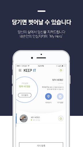 - My Hero는 Keepit App과 블루투스 통신으로 연결되어 있어야만 사용할 수 있으며, 스마트폰이 GPS 및 인터넷 연결이 되어 있어야 긴급 SMS 서비스를 정상적으로 사용할 수 있습니다.