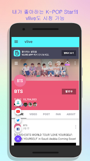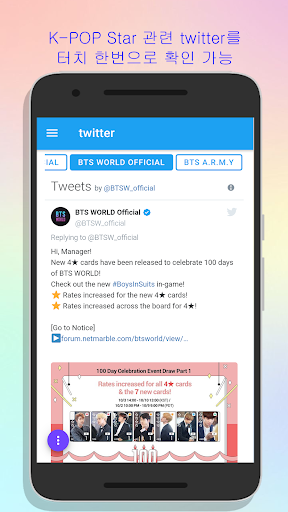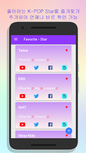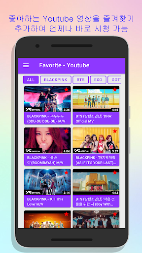 이 앱 하나면 좋아하는 kpop 스타뿐만 아니라 모든 kpop 스타의 수많은 뮤직비디오, SNS, 관련 사이트들을 확인하시고 즐기실 수 있습니다.