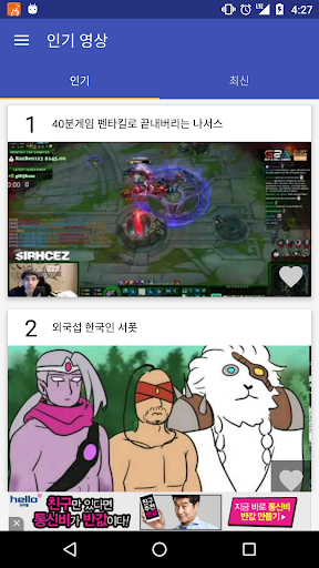 지금 화제가 되고 있는 롤 영상을 제공합니다. 프로게이머와 고랭커의 플레이 영상을 언제든 볼 수 있습니다. 좋아하는 영상을 표시하고, 쉽게 다시 확인하세요.
