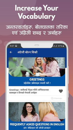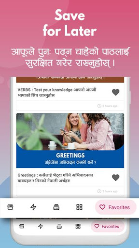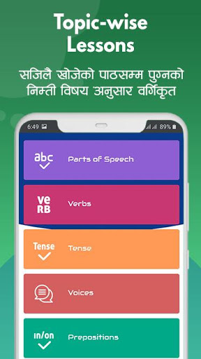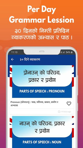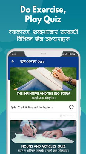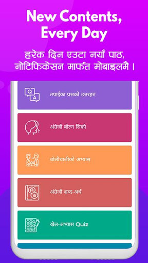 We've collected hundreds of contents to improve your vocabulary, grammar skills, listening skills, reading skills, and speaking skills. We've dozen of English to Nepali interviews, conversations, basic grammar lessons, grammar and language exercises. We've an inbuilt message box from where you can ask us questions directly and get the answer inside the app. You can access our contents even when you are not connected to the internet. Our offline caching system will store your lessons so that you can access it anywhere, anytime. You can clear it anytime to lessen your mobile storage too from the app setting.