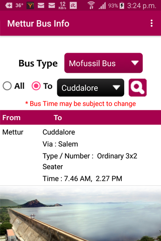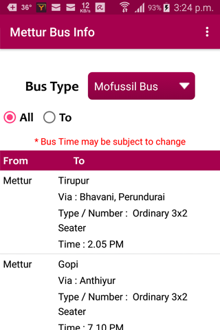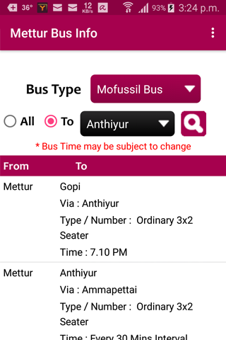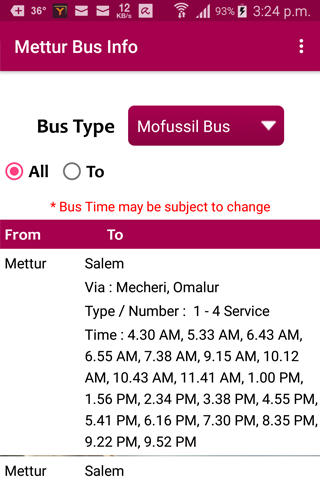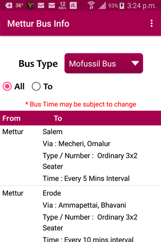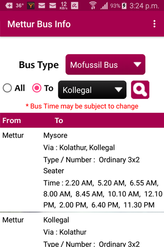 This app provide all information about Mettur Mofussil bus and Town bus.