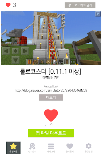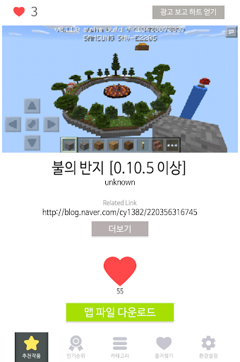 : 본인이 직접 제작한 모던 하우스, 모던 시티, 탈출맵, 게임맵, 전쟁맵, 롤러코스터, 생존맵, 점프맵, 경제맵 등 다양한 분야의 맵 파일을 전세계 마인크래프트 유저와 공유할 수 있습니다. 앱에 등록되어 있는 페이스북, 네이버 카페를 통하여 맵 파일을 등록할 수 있습니다.