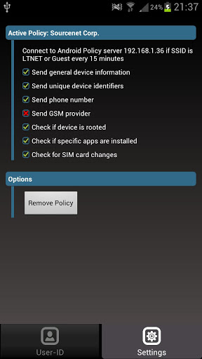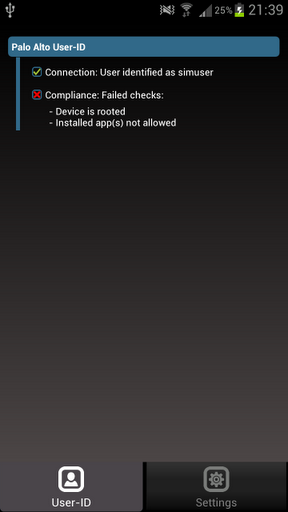 IMPORTANT NOTES: This application will not operate without the necessary backend software. While the beta test is restricted to a closed user group please feel free to contact us if you are interested in the product or release date. Make sure you read and agree to the disclaimer prior to downloading the app.In a nutshellMobile UserID enables customers of Palo Alto Networks to securely connect their Android users to the corporate network if their devices meet a given security compliance policy. UserID works by identifying a user based on hisher phone number or any device identifier, such as IMSI, IMEI or SIM serial number which is either stored in a MS Active Directory, any other LDAP server or a local list. Once a user has been assigned to a compliant device, the firewall allows access to that user by means of Palo Alto39;s UserID Agent using its XML API. Features of Beta1 Identify users based on phone number, imsi, imei or sim card serial number Leverages MS ActiveDirectory, any other LDAP server or a local list to assign a user to a device Compliance: Detect and block rooted devices Compliance: White or blacklisting of apps Compliance: Detect and prohibit SIM card changes Compliance: White or blacklisting of sim serial number, IMSI, IMEI, device model, operating system version, provider MNC, MCC, country MCC or client version Runs as a background process which checks and connects periodically optimized for low battery consumption in Android 2.3 or highercommunication attempts to the backend server can be limited to occur only when connected to certain wireless networks specified in the policy SSIDs Optional notification when connected, invisible to users Provision user either with the device39;s WLAN ip address or the ip address seen by the backend server in case of NAT Device data sent to backend server is encrypted AESRequirements Backend Server APServer 1.0 or higher PAN Firewall running Panos 4.X or 5.X UserID Agent with open XML API Handhelds running Android 2.2 or higherDisclaimer1. Note that this app is not officially supported by Palo Alto Networks. 2. The term UserID is used by Palo Alto Networks. This app refers to its technology.3. This app should be seen as a proofofconcept in order to make a firewall aware of Android users. While Palo Alto products were used for the sake of its simple API, the software both, app and backend server is vendorindependent and could be used with other products as well.