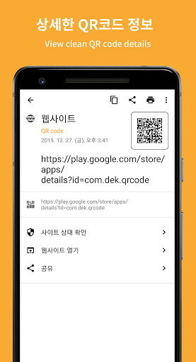앱을 실행해서 QR 코드나 바코드에 카메라를 향하면 코드를 인식해서 바로 스캔 결과를 보여줍니다.