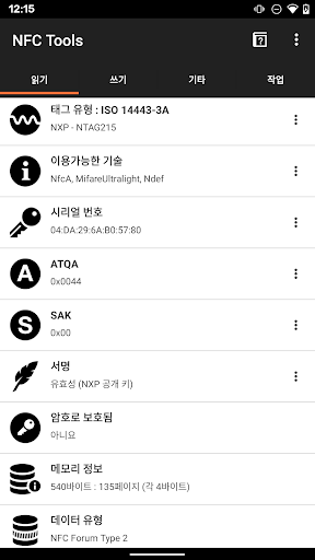 장치를 "읽기" 탭으로 하고 NFC 칩 근처에 통과시키면 다음과 같은 데이터를 볼 수 있습니다: