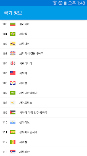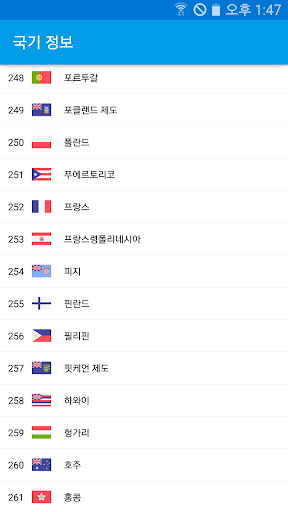 본 앱은 다음 정보를 제공합니다. 1. 국가명 2. 국기 이미지 현재 261개 국가의 국기 정보를 제공합니다.