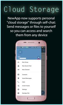 NewApp Messenger 2018 : Secret Chat online & Call now supports personal "cloud storage" through self-chat. Send messages or files to yourself so you can access and search them from any device. Tap on the cloud-shaped icon in the settings of NewApp app or go to "Contacts" and open a chat with yourself, and now you can send there any kind of file (of up to 1,5 GB each) and as many as you want.