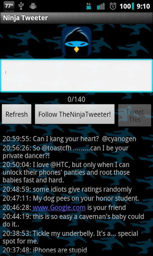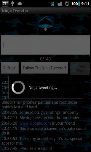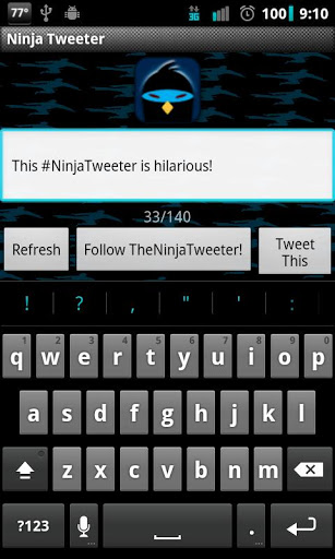 Become the Ninja TweeterDISCLAIMER: Team Win is not responsible for any content submitted to TheNinjaTweeter.note In order to @ people as TheNinjaTweeter, you need to get the pro version here: http:tinyw.in0xS. Pro also removes the adsFollow @TheNinjaTweeter here: http:tinyw.in0wDBecome The Ninja Tweeter Send totally anonymous tweet to your friends but follow The Ninja Tweeter at the same timeBomb your friends, tweet at celebrities, reach millions of people, Ninja Tweet them