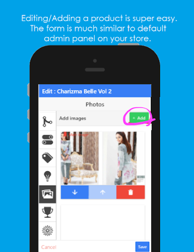 * Add a new product or edit an existing one conveniently with 'Add Product' module. It also helps you to add images from your mobile camera or even select picture from the gallery. Organize pictures in the order you want them to appear and select a main image as the display picture!
