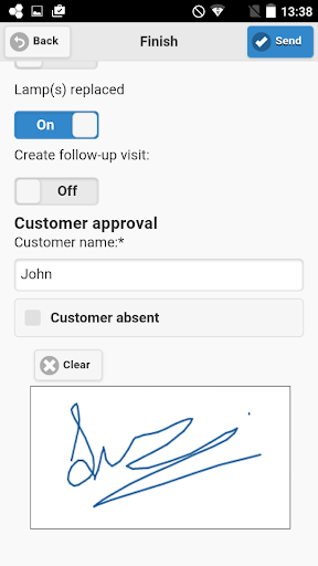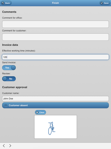 고객에게 권장 사항을 작성하고 사진을 찍으십시오.방문 시간, 사용 된 재료 및 인보이스 데이터를 등록하십시오.