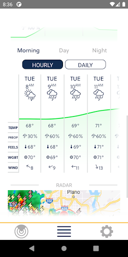 가 - 라이브, 예측 강우 기술, 강수량 지표 (비, 얼음 또는 눈), 및 애니메이션 기능을 갖춘 고해상도 레이더 이미지는 사용자가 인식 유지 폭풍우 위치와 예상 직책.