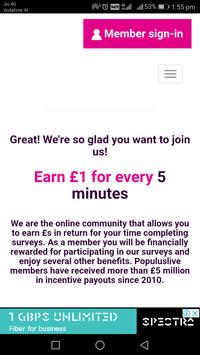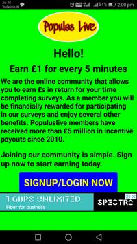 We are the online community that allows you to earn £s in return for your time completing surveys. As a member you will be financially rewarded for participating in our surveys and enjoy several other benefits. Populuslive members have received more than £5 million in incentive payouts since 2010.
