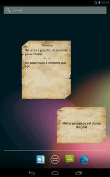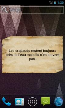 Proverbe africain is a widget, to install it on smartphones below the 3.0 android versions, hold your finger on the phone's home screen screen, select widgets from the menu that appears, select "Proverbes Africains Free". For smartphones with android 3.0 versions or later, in the menu of your smartphone, select the widgets tab and in the list of widgets, select the icon of "Proverbes Africains Free", hold and drag it to one of the home screen of your choice.