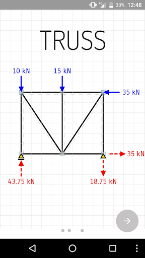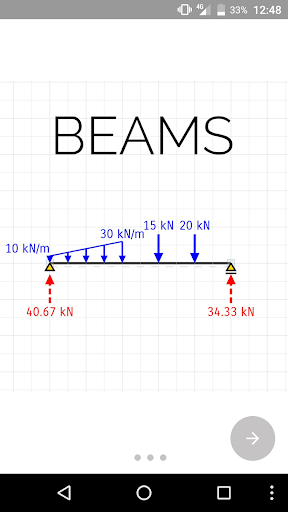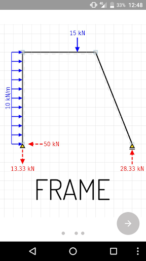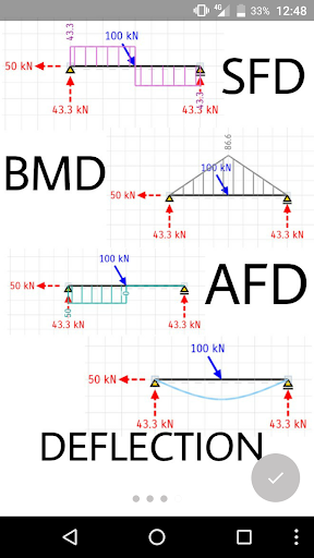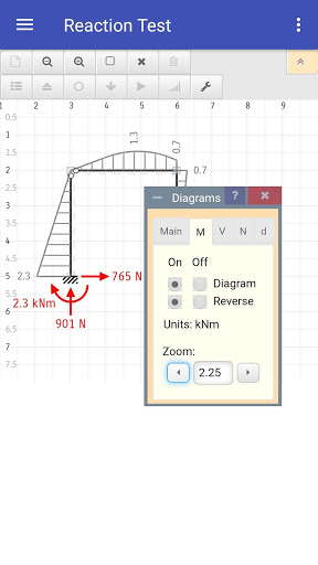 With our app you can solve beams, frames and trusses with their respective Shear force diagram, Bending moment diagram, Axial force diagram and Deflection diagrams.