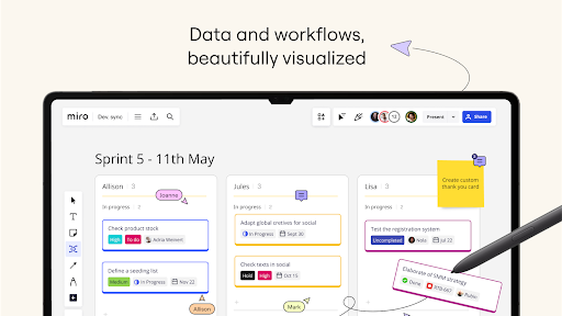 Miro의 화이트 보드 앱을 사용하면 언제 어디서나 만들 수 있습니다.200 개가 넘는 사전 제작 된 템플릿, 드래그 앤 드롭 인터페이스 및 공동 작업자에 대한 제한이없는 화이트 보드에서 작업하는 것이 빠르고 재미 있습니다.