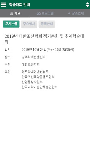 2019년 대한조선학회 정기총회 및 추계학술대회 일시: 2019년 10월 24일 ~ 25일 장소: 경주화백컨벤션터 주최: 대한조선학회 [메뉴구성] 학술프로그램: Track, Daily, Time, 즐겨찾기 학술대회안내: 개요, 프로그램, 장소안내 종합안내: 교통안내, 숙박안내 후원사 Notice PDF File Download Map [학회홈페이지] http://www.snak.or.kr
