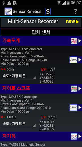어떤 센서가 새 태블릿 또는 스마트 폰에 내장되어 있습니다? 무엇에 대한이 자이로 스코프의 작동 속도를? 휴대 전화 안에 다른 센서에 대한 무엇인가? 당신은 그런 질문이있는 경우,이 응용 프로그램은 당신을위한 것입니다.