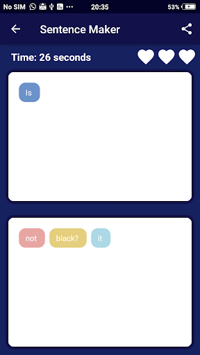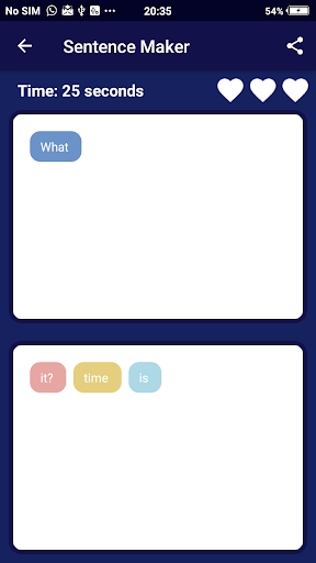 Sentence Maker is Fun and Educational Game. This app is uses to make words from letters and then to make sentences from words. Practice Sentences with commonly used parts of Speech (Verbs, Prepositions, Phrasal Verbs). Using the Sentence Maker you will be able to improve your Vocabulary, Grammar & understanding of the English Language.