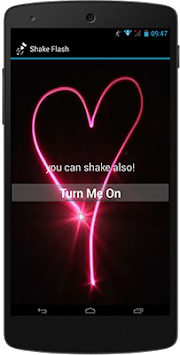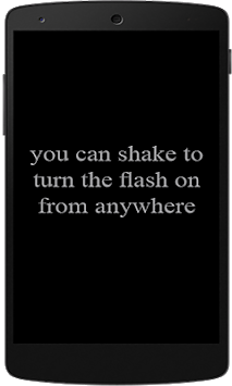 Shake Flash application to turn the flash light on simply by button within the application or by shaking the device from anywhere, even if the screen is locked, its enough to press the power button and then shake it to turn on and shake again to turn off, easy to use and simple in design make it the application that meets your needs without unnecessary things, and it is only use 0.01 of CPU like it not there and has no or minimal effect on your battery.