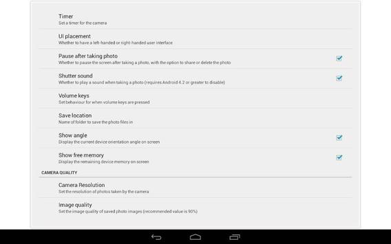 * Photo mode "NR" takes photo burst and merges to reduce noise (Camera2 API, only supported on some devices). Focus Bracket mode (Camera2 API only). Ghost image option to overlay last photo or selected image. Audio level meter option for recording video. Flat (log) video profile (Camera2 API only).